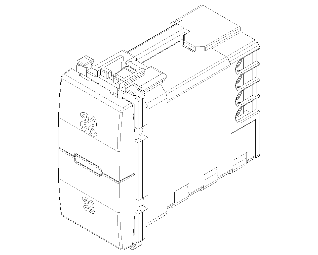 Dimmer 220-240 V~ 50/60 Hz a taglio d'onda per ventilatori 15-150 W, comando ON/OFF e regolazione con pulsanti incorporati o da più punti con pulsanti NO, regolazione 4 velocità, funzione Superslow, individuazione al buio, grigio. Apparecchio non installabile nei contenitori Isoset