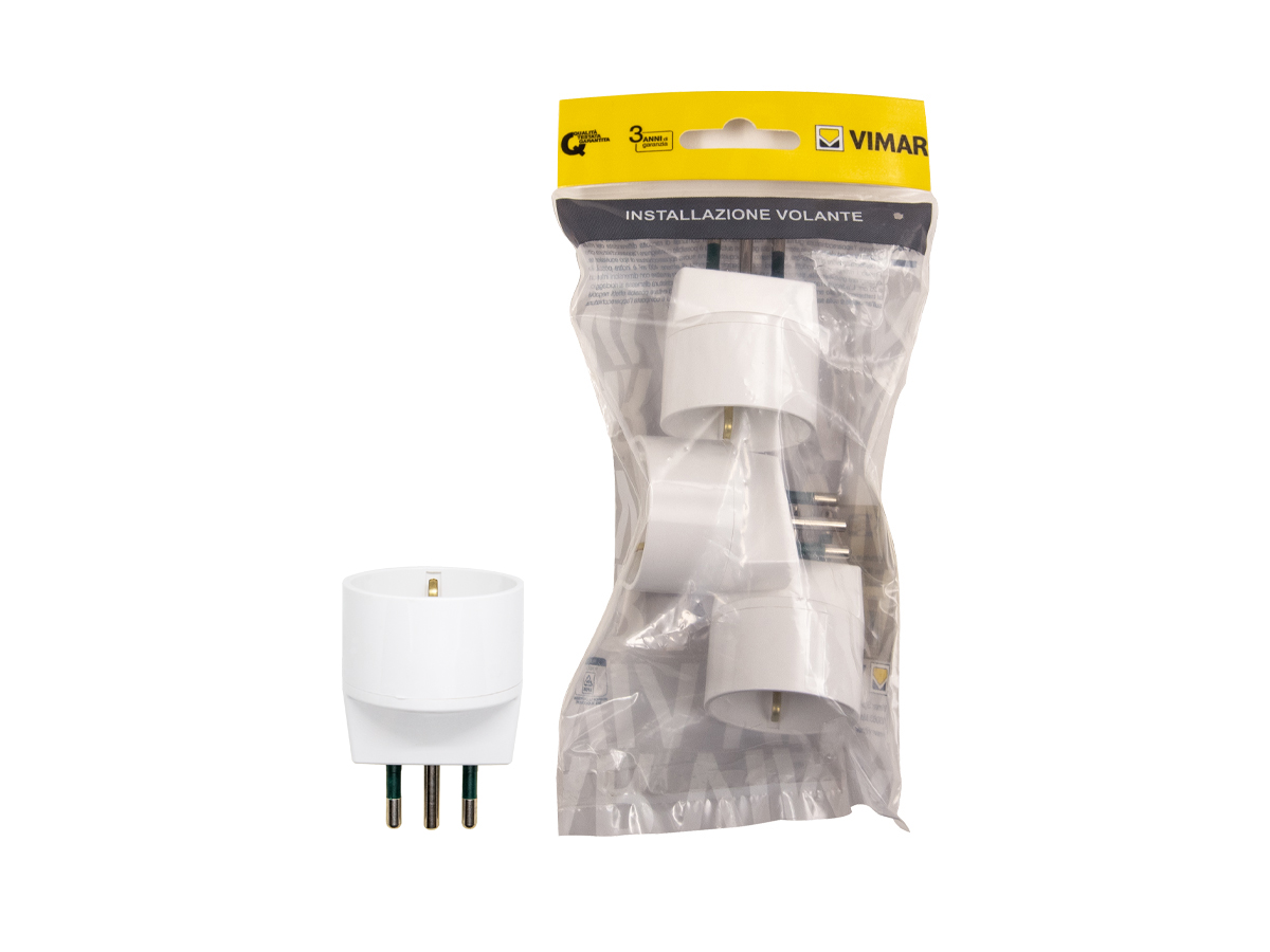 Adattatore semplice SICURY 250 V~, bianco - max 1500 W - spina 2P+T 10 A standard italiano tipo S11 - presa 2P+T 16 A standard italiano tipo P30 (contatti di terra laterali e centrale), 3 pezzi