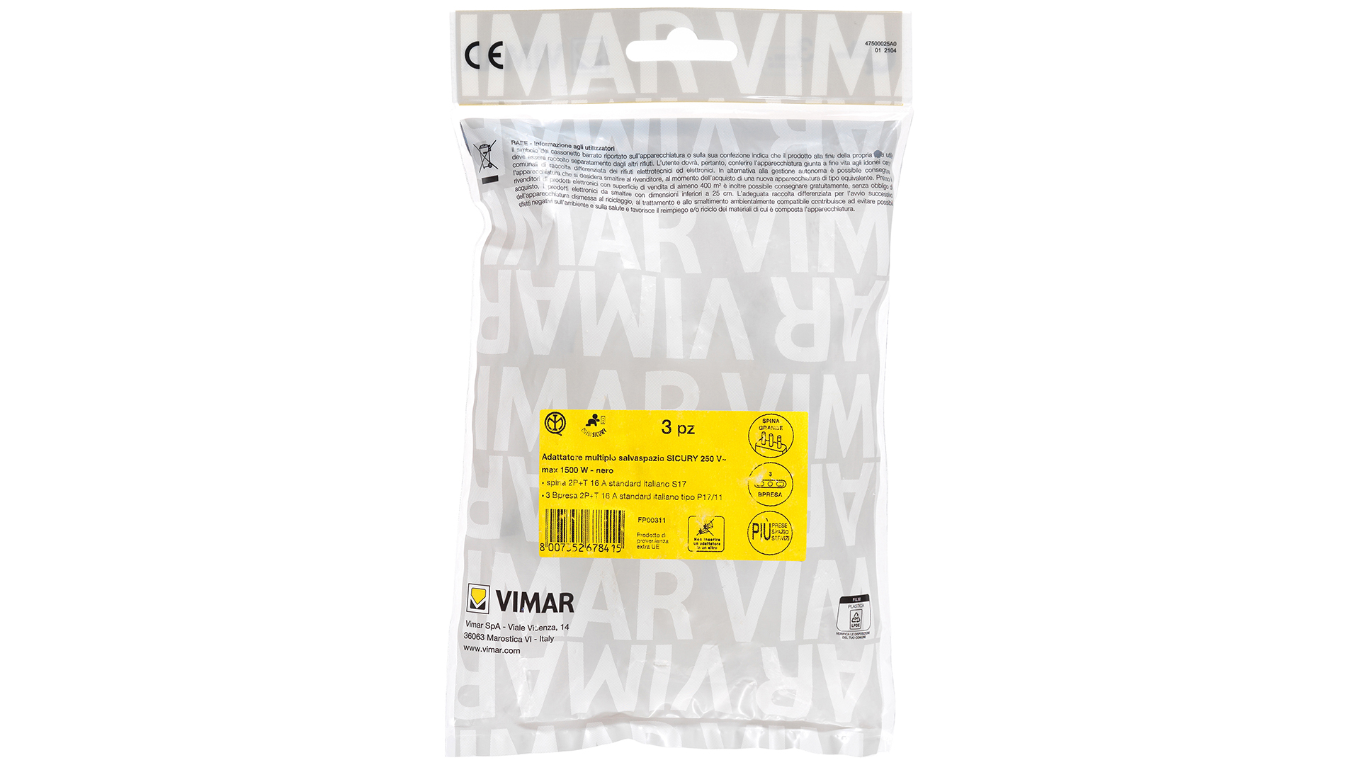 Adattatore multiplo salvaspazio SICURY 250 V~, nero - max 1500 W, spina 2P+T 16 A standard italiano tipo S17, tre Bpresa 2P+T 16 A standard italiano tipo P17/11, 3 pezzi