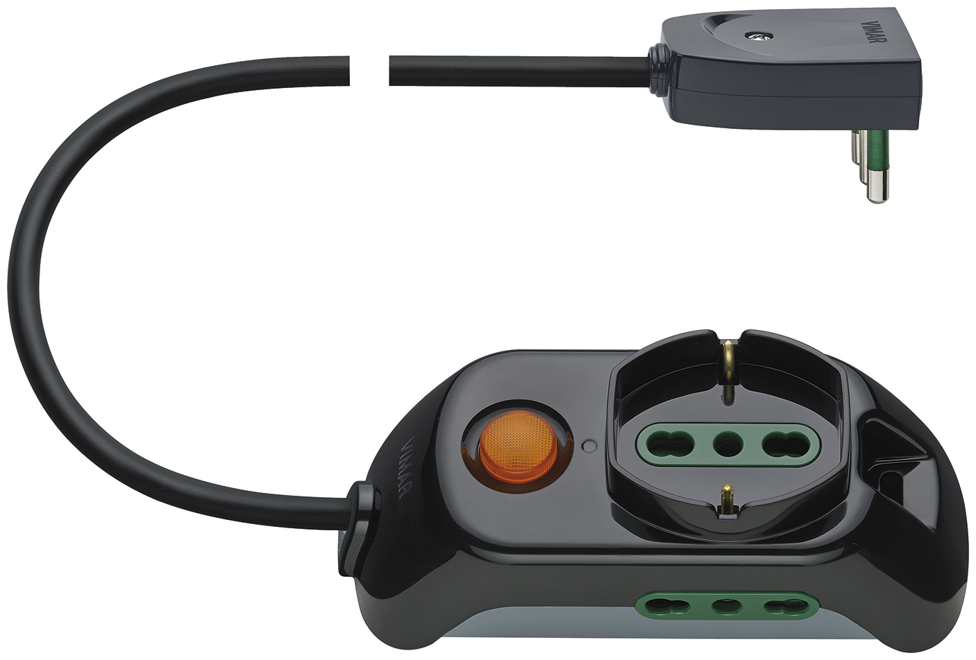 Presa mobile multipla 2P+T 16 A 250 V~, 1 uscita SICURY universale standard italiano tipo P40, 2 uscite SICURY standard italiano tipo P17/11, interruttore luminoso, cavo da 1,5 m con 3 conduttori da 1,5 mm2 (3G1,5), spina orientabile ricollegabile 2P+T 16 A standard italiano tipo SPB17, potenza massima prelevabile 3680 W, nero